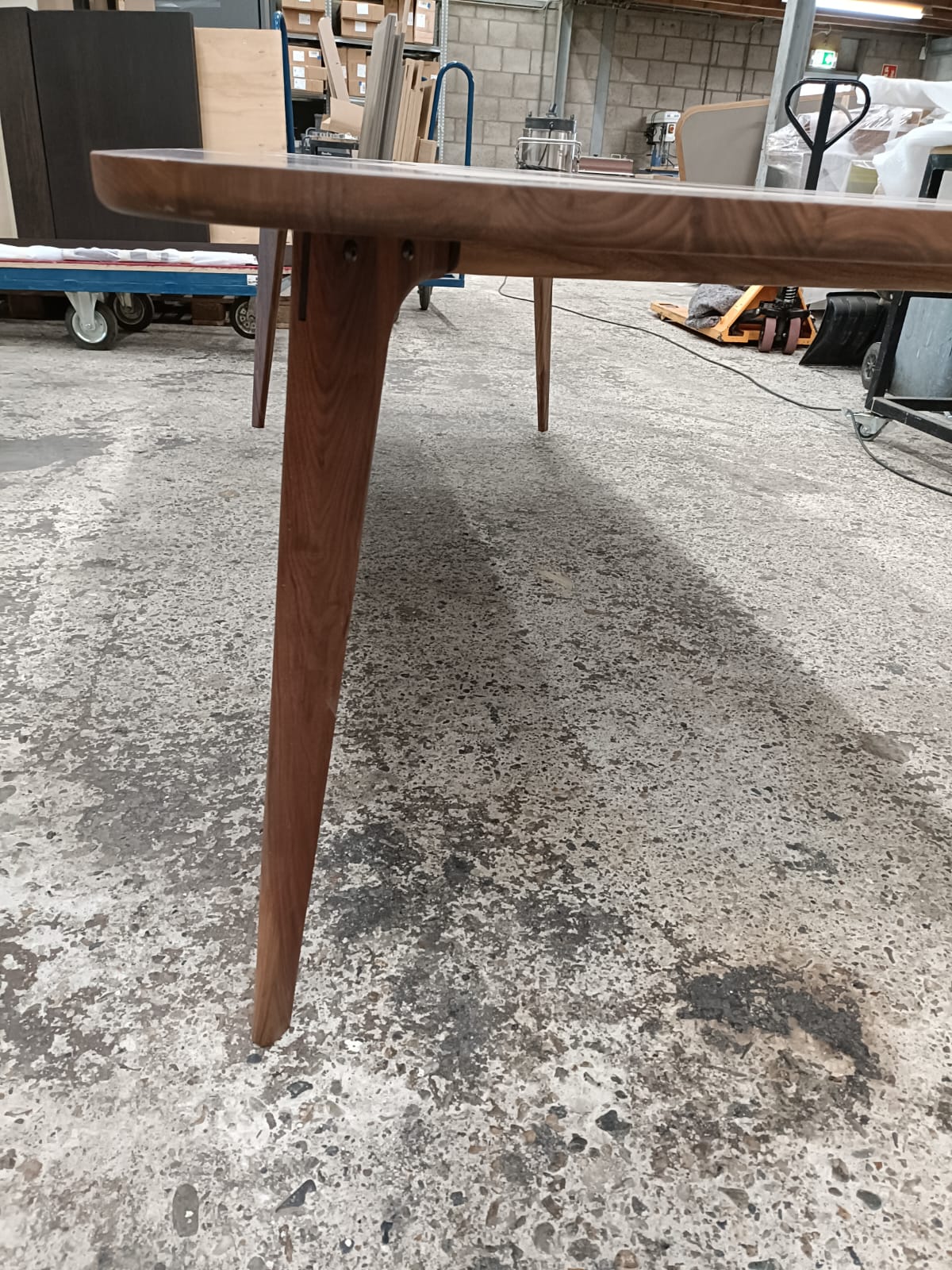Het tafelblad is nieuw, uit hoge kwaliteit notenhout, met een gemakkelijk te onderhouden matte lakafwerking. Dit maakt de tafel niet alleen een esthetische toevoeging aan uw interieur, maar ook een praktische keuze voor dagelijks gebruik.