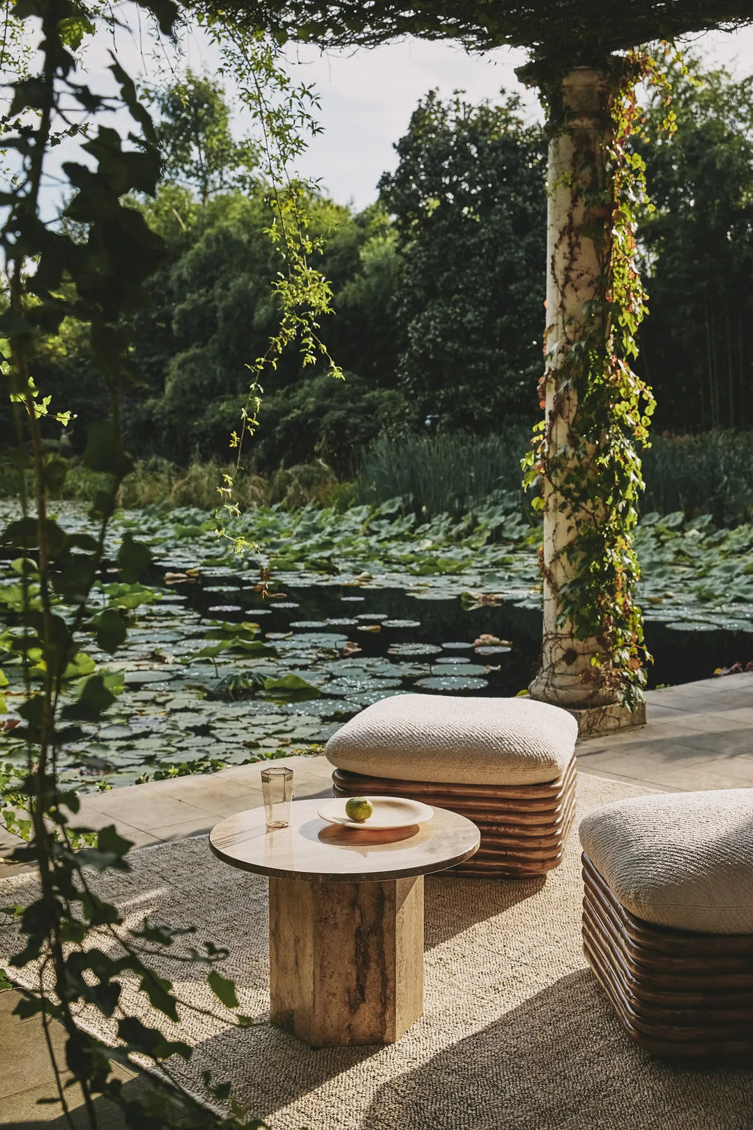 GamFratesi's Epic Tafel voor GUBI, geïnspireerd op antieke architectuur, is een eerbetoon aan Italiaans travertijnsteen. Elke tafel, uniek door zijn aderen en textuur, verenigt natuurlijke schoonheid met sculpturaal design.
