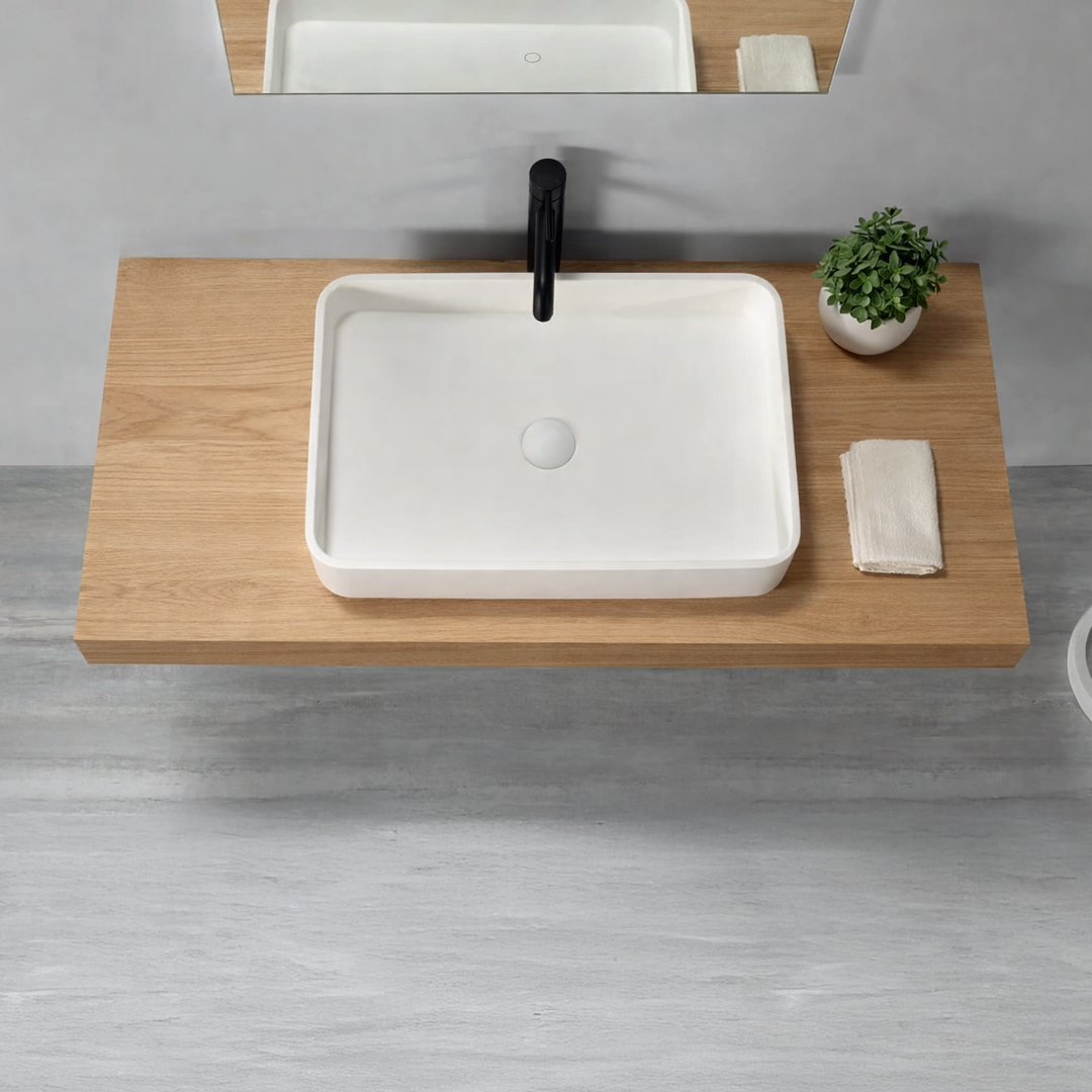 Bij Houtmerk maken we uw badmeubel, kolomkast of wastafelplank precies op maat, perfect in verhouding met de ruimte. Bijvoorbeeld ondieper in een kleine badkamer, of passend tussen twee wanden. De luxe, soft-close lades hebben een ingefreesde minimalistische greeplijst of greep.