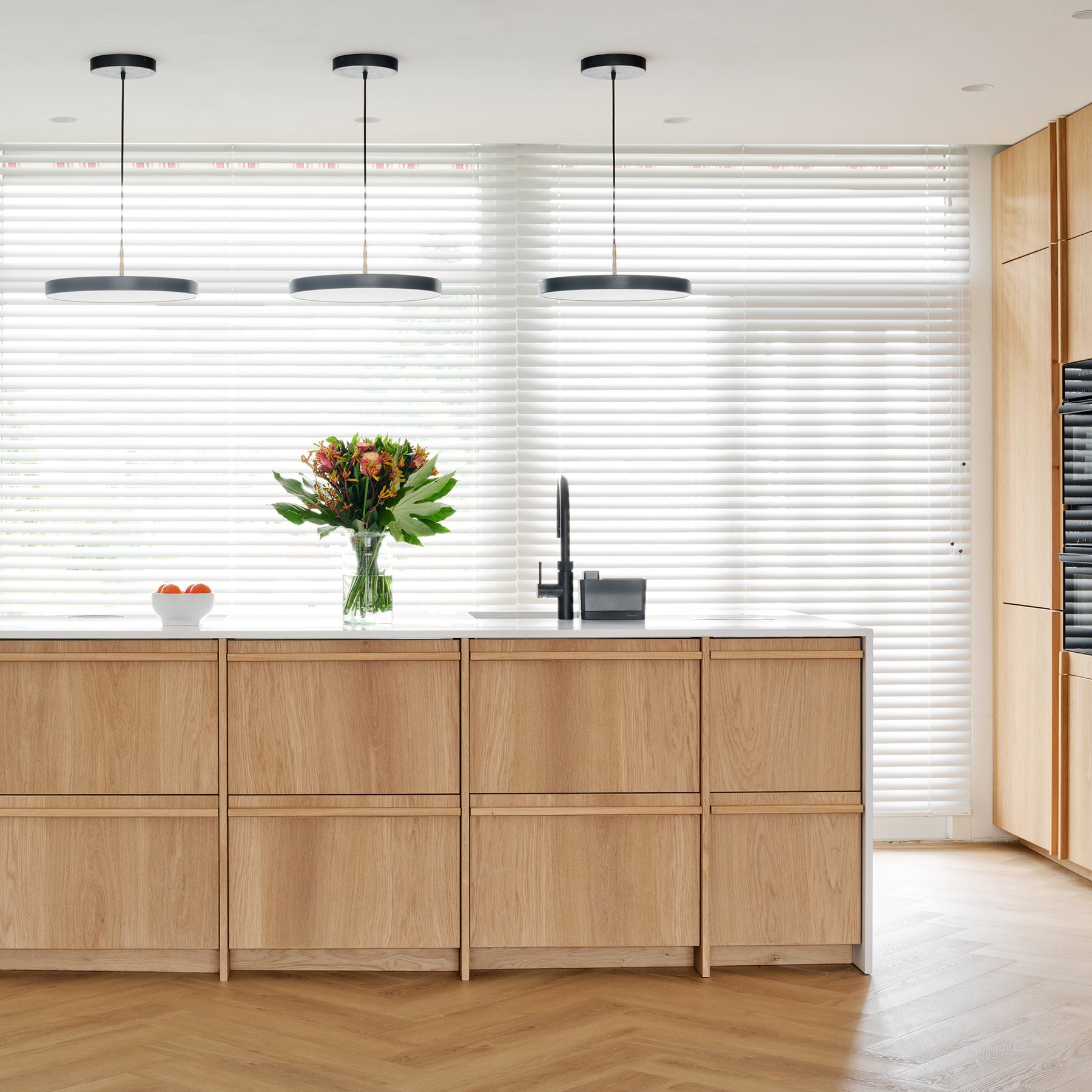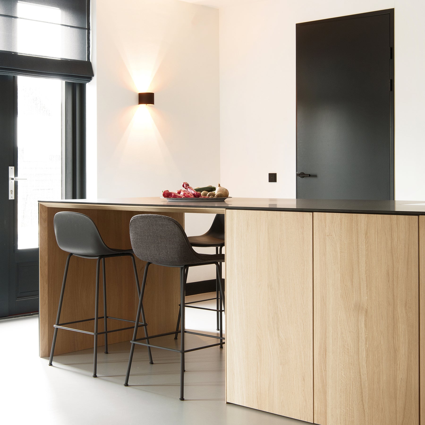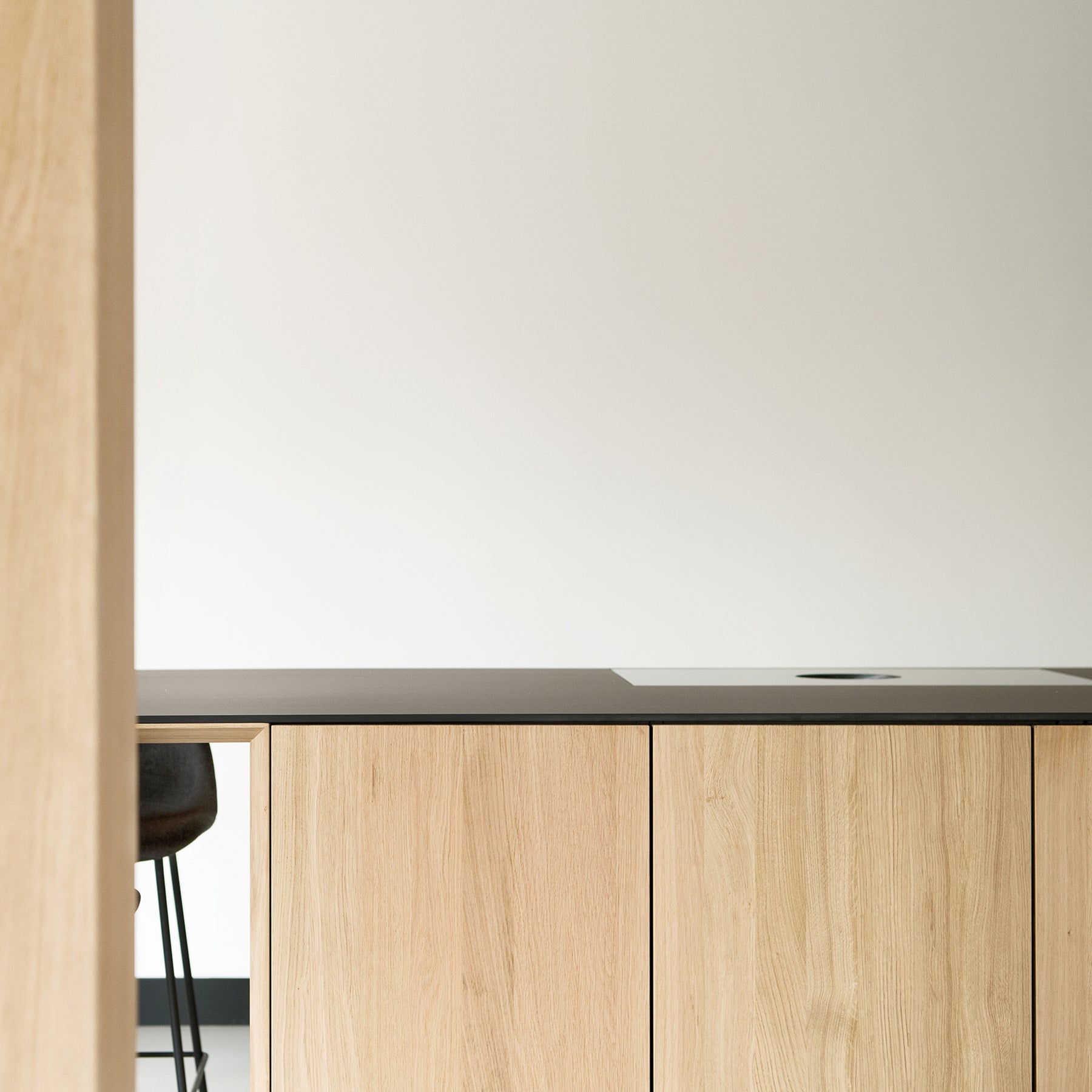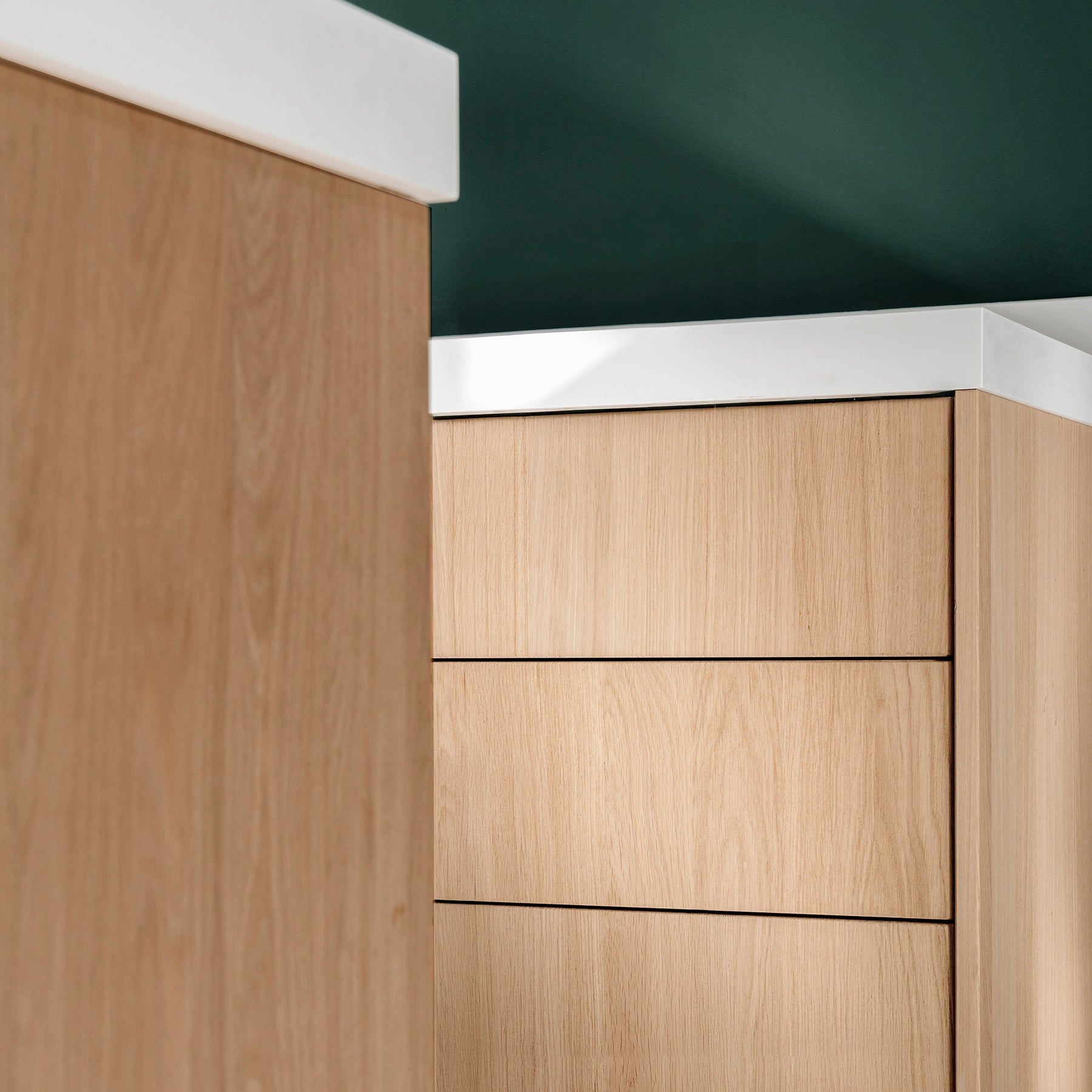 Het eikenfineer heeft een lichtbruine, crème of beige tint die onder invloed van licht verkleurt van geel naar goudbruin. De oppervlakken zijn gereed om zelf af te werken met beits, matte lak of hardwaxolie. Combineer naar wens met opbouwgrepen van hout, aluminium of staal, of kies een push-open systeem voor een strak front zonder greep.