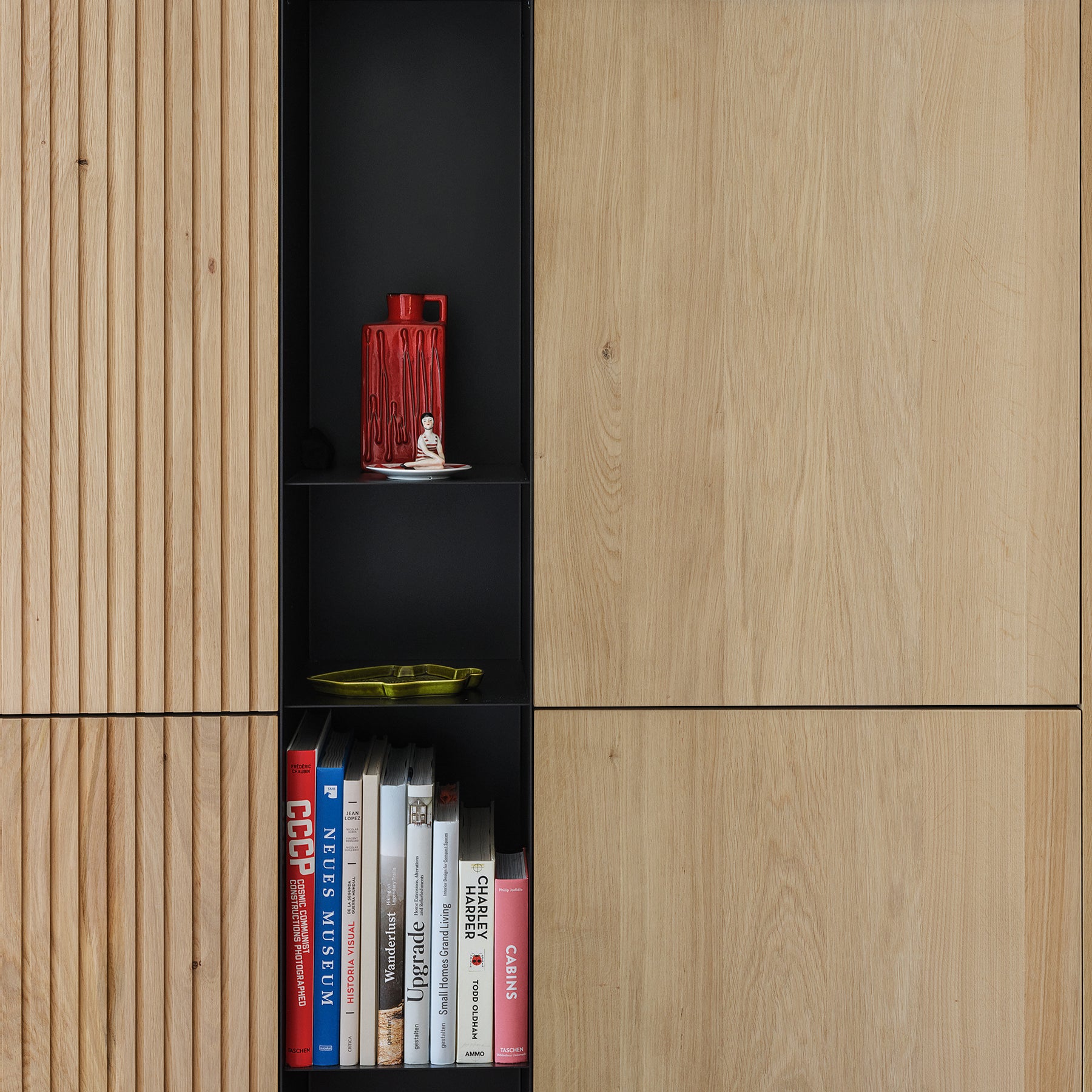 De kastmodules kunnen worden gestapeld tot grotere en extra hoge composities, waarbij fronten kunnen worden samengevoegd tot grotere oppervlakken. Voor kamerhoge kastenwanden kunnen fronten op aanvraag worden verlengd met maximaal 15 cm vanaf onder- of bovenzijde van het kastelement - de deuren overlappen de plint tot aan de vloer of het plafond.