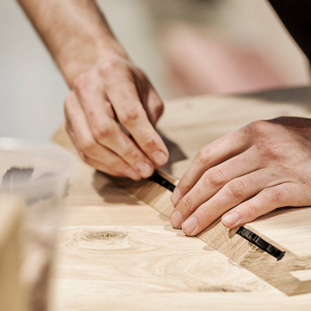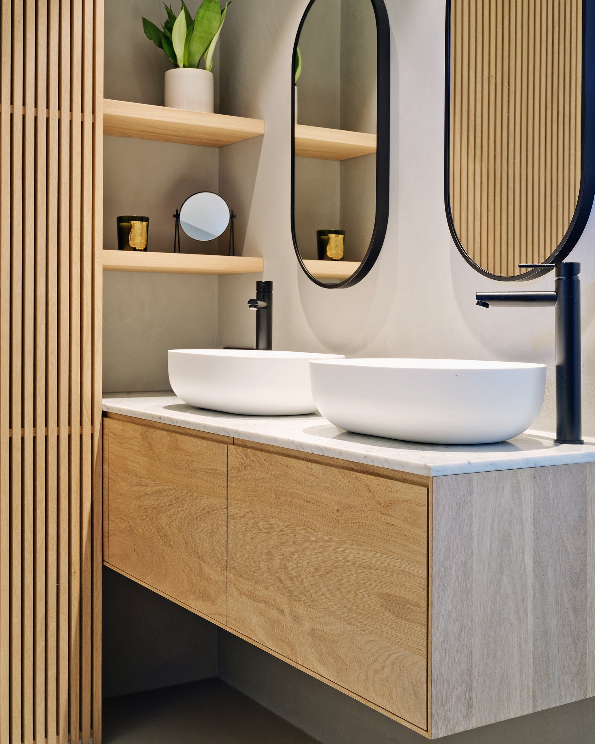 Bij Houtmerk maken we uw massief houten badmeubel, kolomkast of wastafelplank precies op maat, perfect in verhouding met de ruimte. Bijvoorbeeld ondieper in een kleine badkamer, of passend tussen twee wanden. De luxe, soft-close lades hebben een ingefreesde minimalistische greeplijst.
