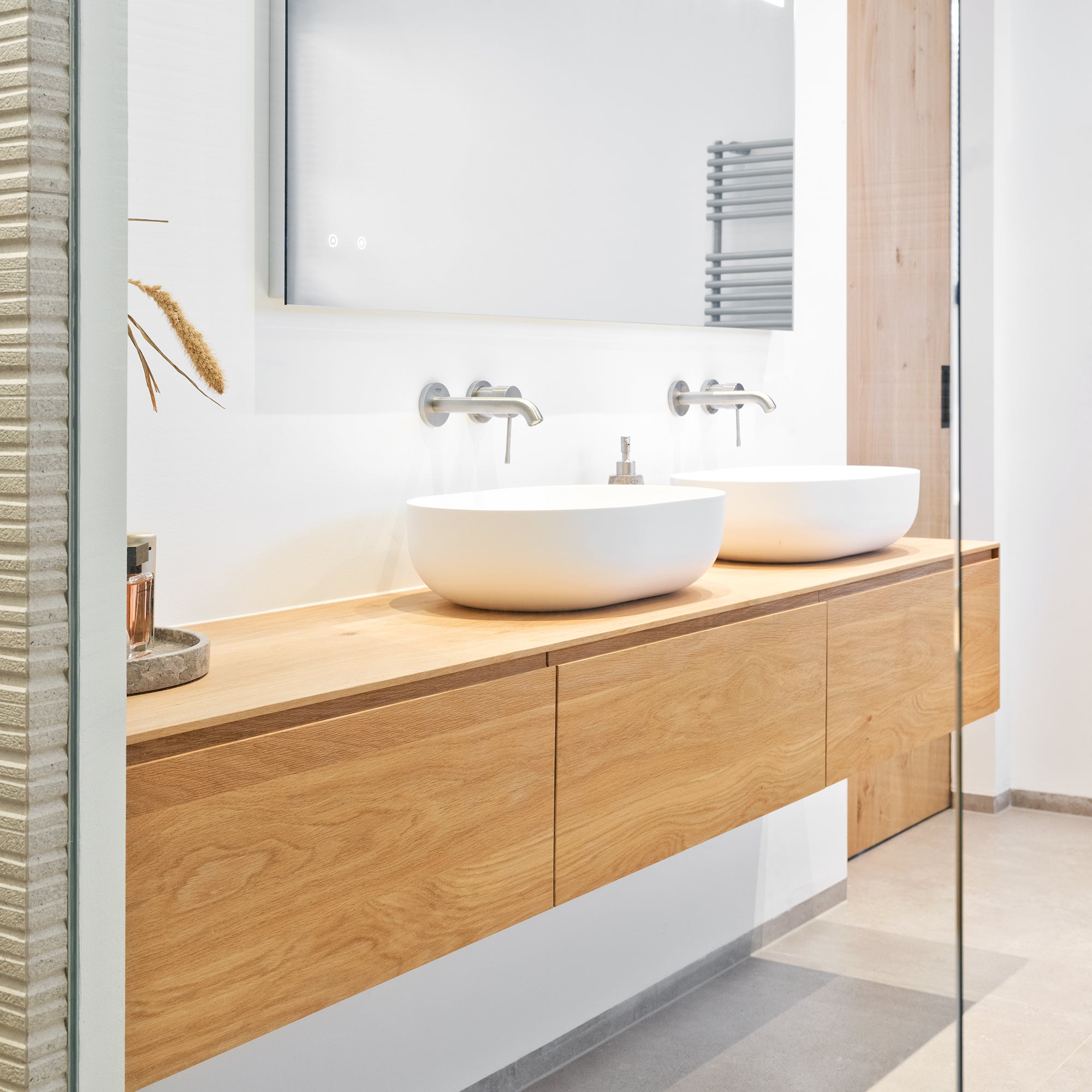 Uitgangspunt is onze collectie, waarbij verdeling van de lades en afmeting van het houten badkamermeubel volledig is te bepalen. Uitsparingen voor sifon, afvoer of waskom zitten precies op de juiste plaats. Onze interieurarchitect helpt de materialen combineren met uw sanitair en tegels.