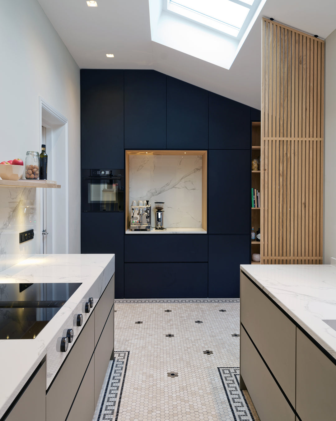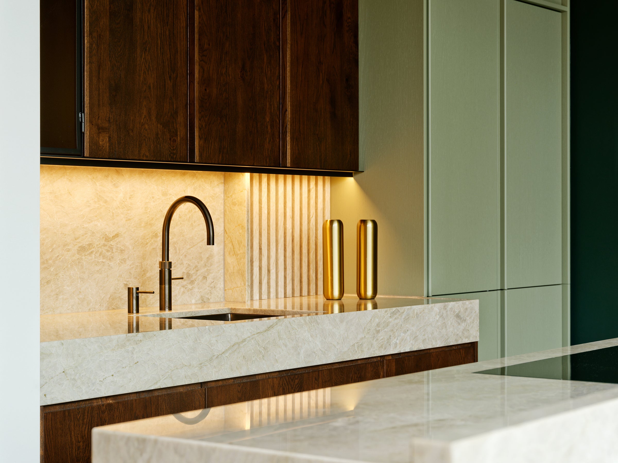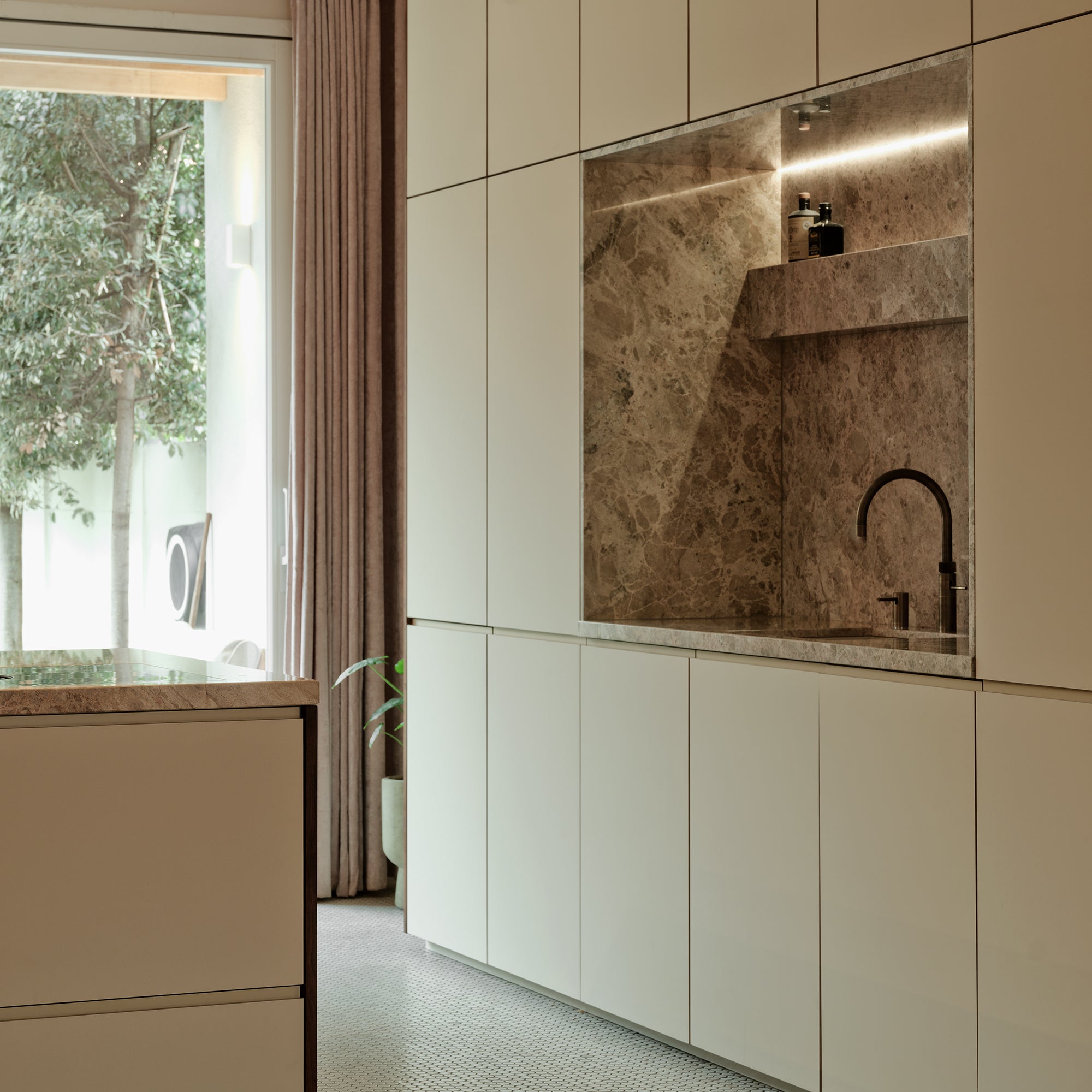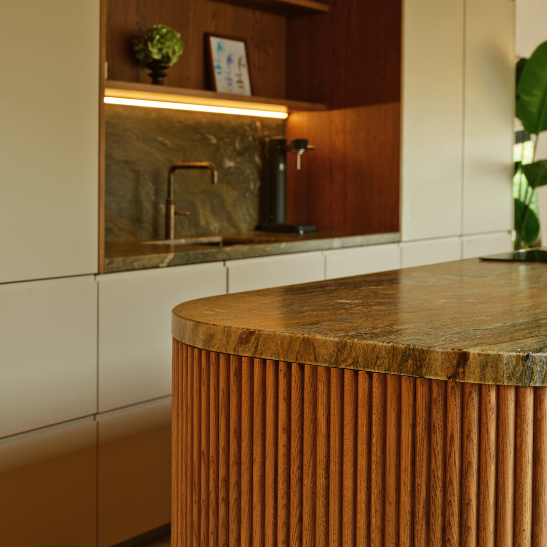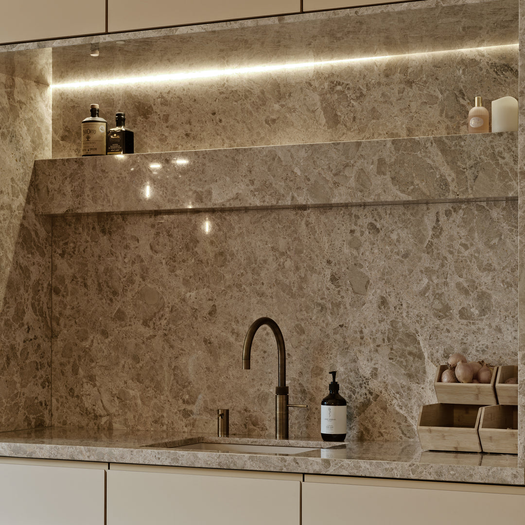Creëer een maatwerk keuken met een prachtige stenen nis. Gebruik de nis voor koffie, apparatuur of een spoelgedeelte. Voeg een bijpassende wandplank van steen toe, compleet met LED-verlichting. Integreer het geheel in een hoge kastenwand van hout of matte Fenix oppervlakken.
