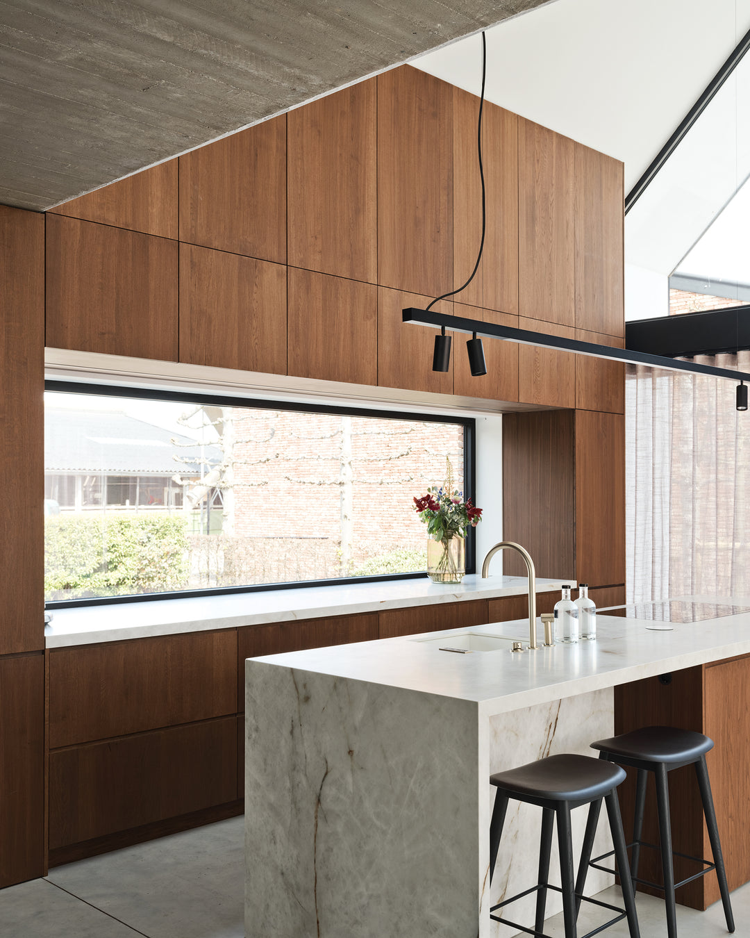 De overtreffende trap in steen. Een kookgedeelte, barnis én afsluitende stollenwand in exclusief marmer. Houtmerk ontwerpt keukens die interieur en architectuur samenbrengen.
