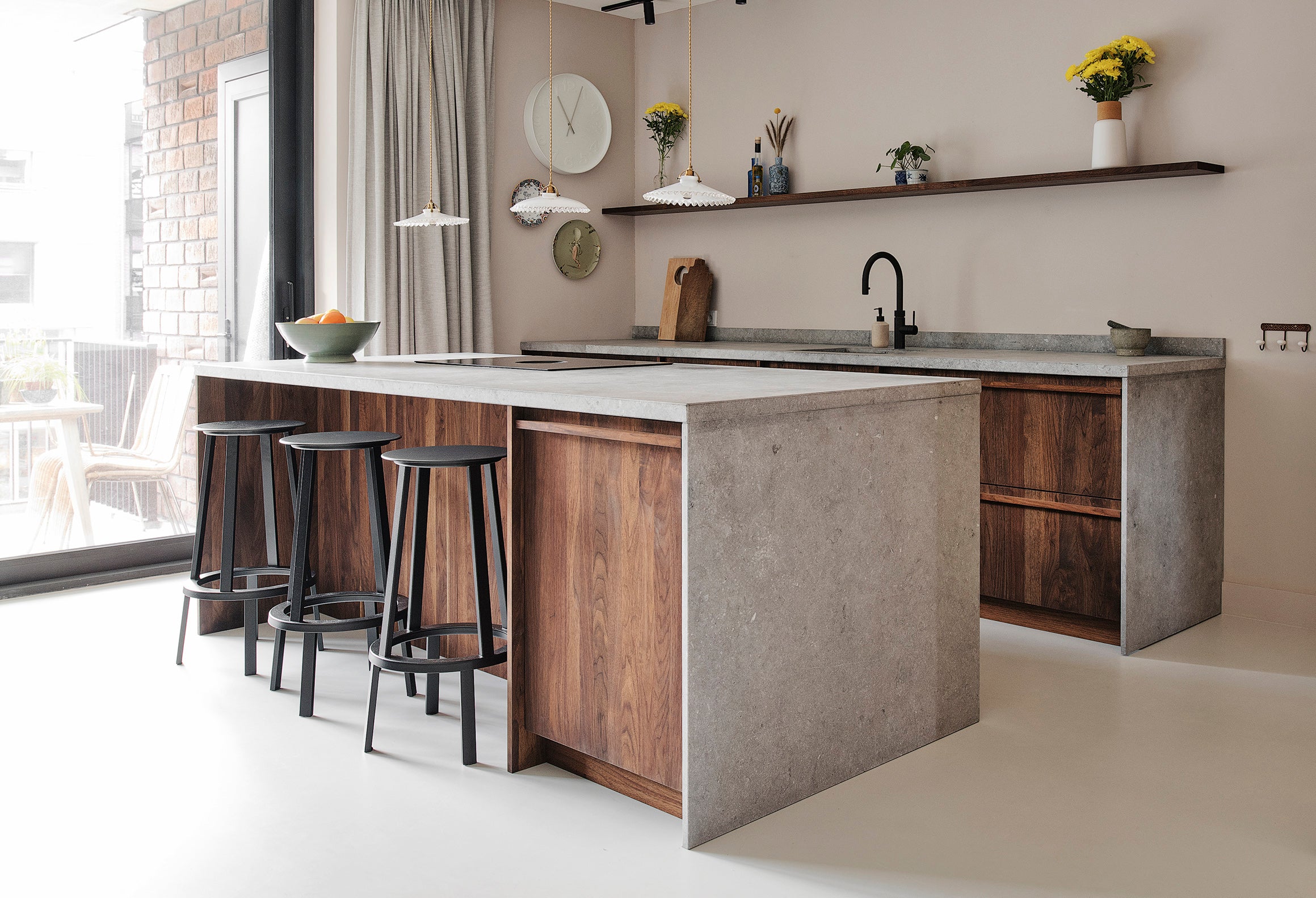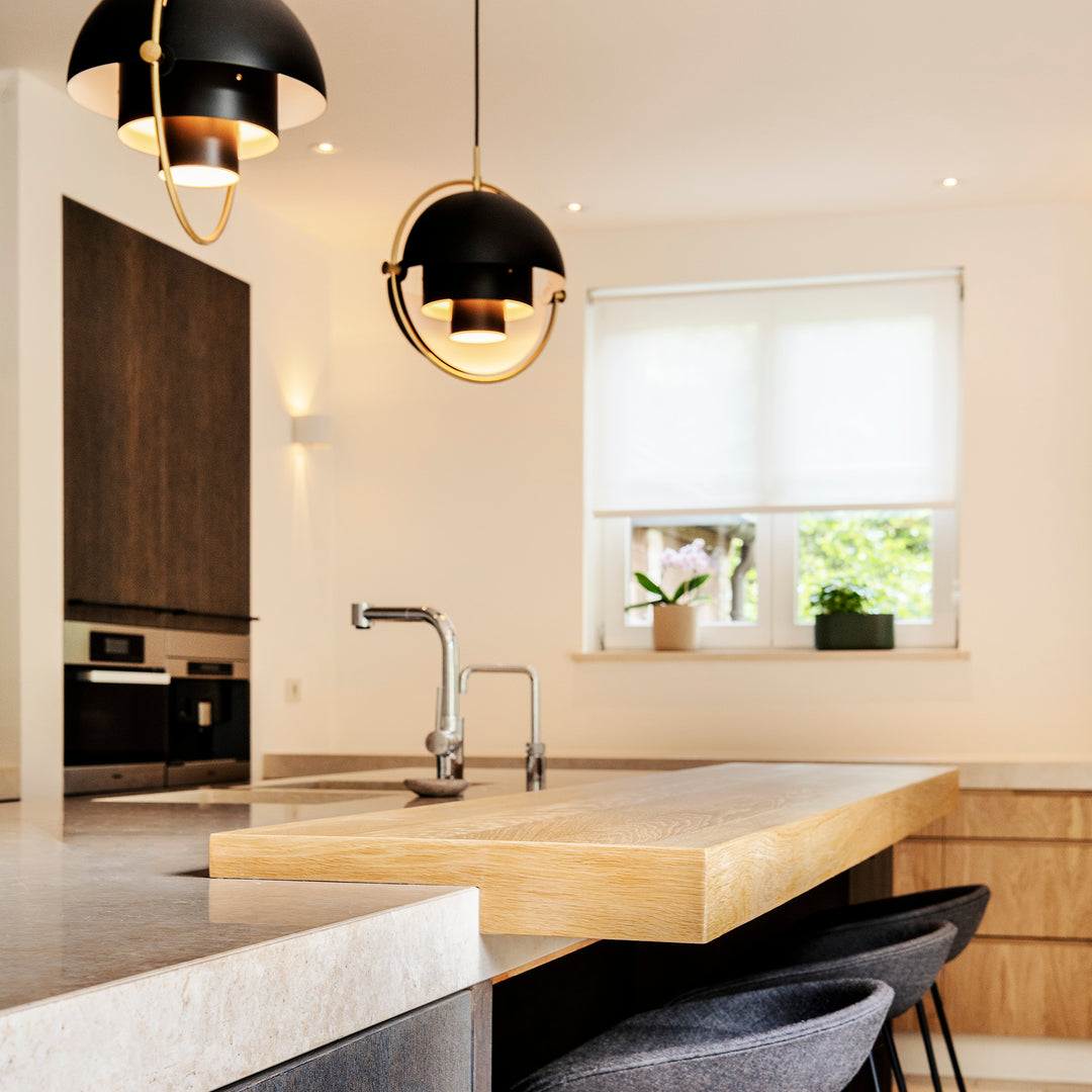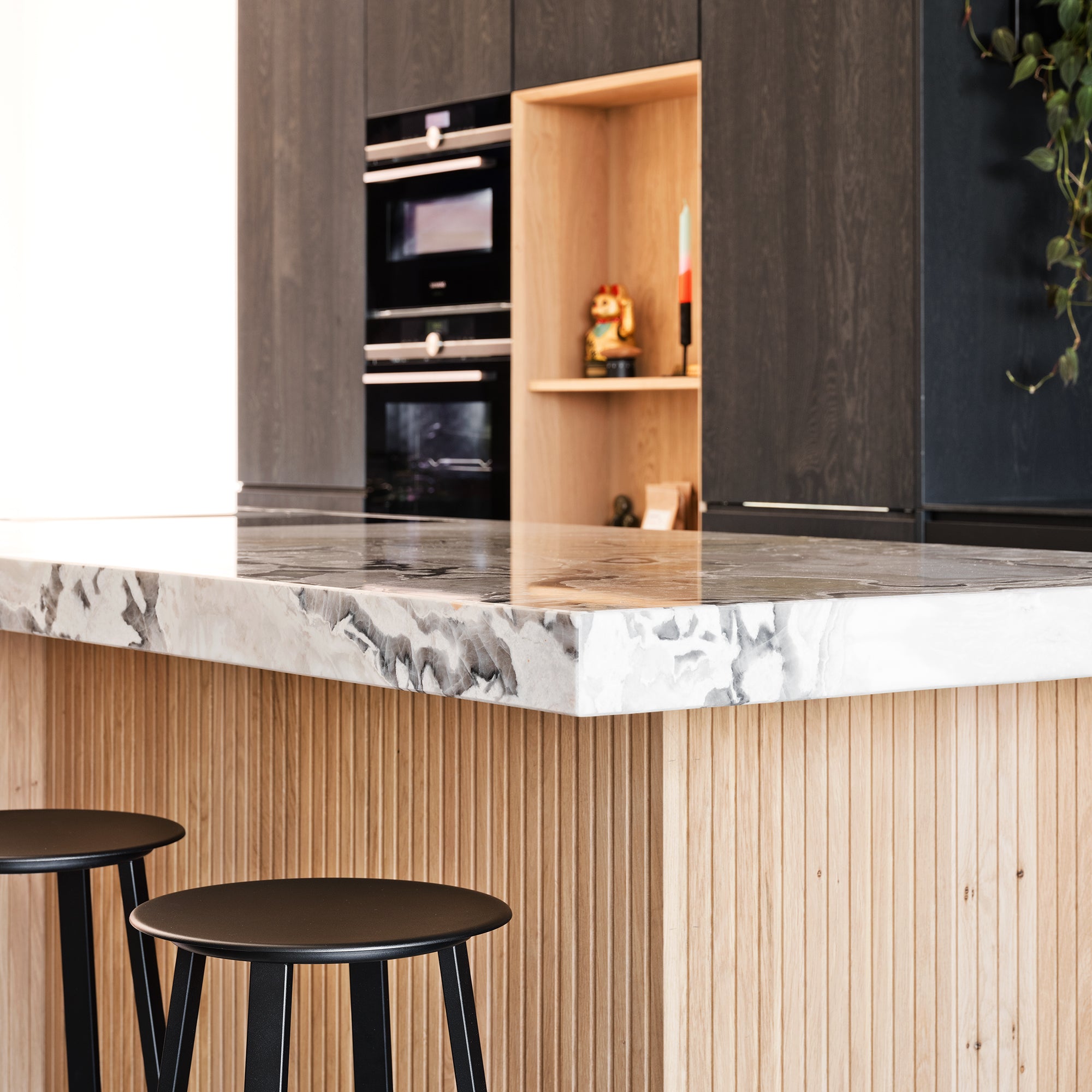 Bijzondere designkeuzes en subliem maatwerk. Onze interieurarchitecten creëren prachtige combinaties van dikke en dunne bladen, tot wel tot 250 cm lang uit één stuk. Voor een echte blikvanger passen we dikteverschillen in uw kookeiland toe.