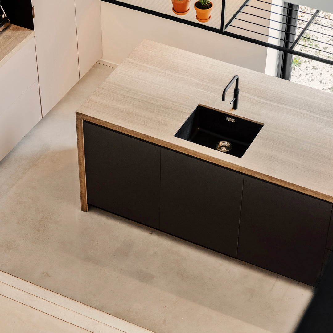 Ontdek maatwerk designelementen van steen. Creëer een stijlvol stenen spoelgedeelte met een grote wasbak of wastrog. Geniet van de betonachtige afwerking en textuur. Ervaar het gemak van een geïntegreerd afdruipgedeelte.