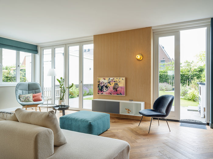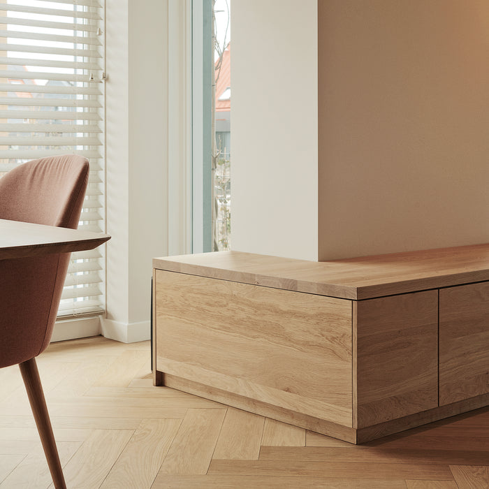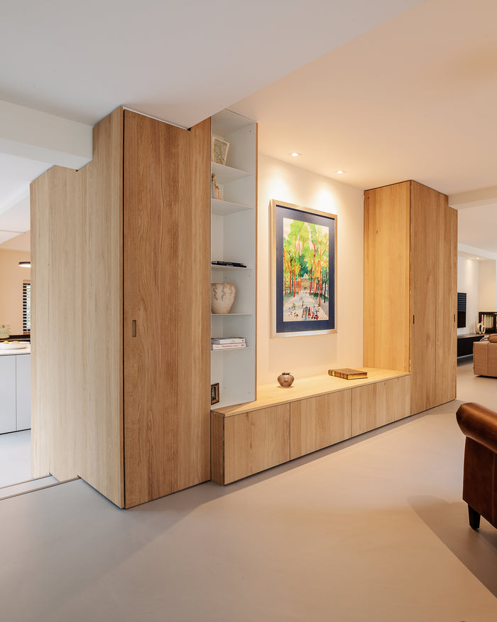 Gefilterd licht, poederachtige tinen, licht hout op de vloer én in de maatwerk meubels. Zoals het maatwerk dressoir voor de televisie en erker. Als accent komt zwart terug in de taatsdeuren, roomdivider en maatwerk niskast voor de hal.