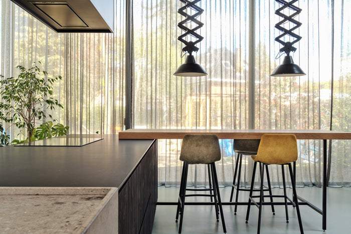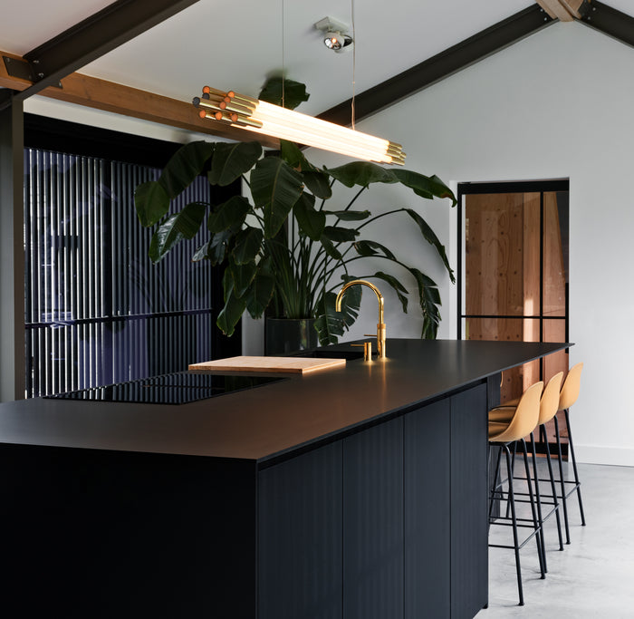 Matzwart Arpa Fenix op het kookeiland, met een maatwerk barframe, diepzwarte Douglas fronten. De niskasten zijn van gecoat plaatstaal. De bediening van de Bora kookplaat is verwerkt in de fronten.