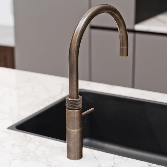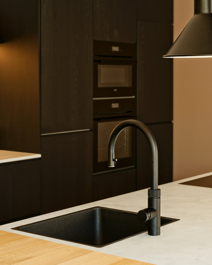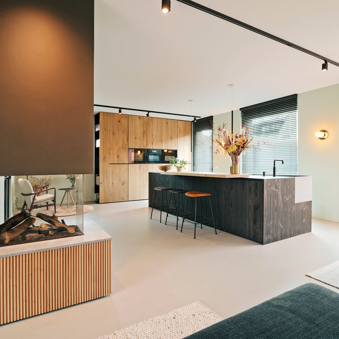 In deze woning hebben we rustiek eikenhout gecombineerd met een zwart Fenix keukenblad en bijpassende fronten. Blikvanger is het spoelgedeelte van steen met onze Concreto afwerking. Kokend water onder handbereik met onze Quooker-kranen.