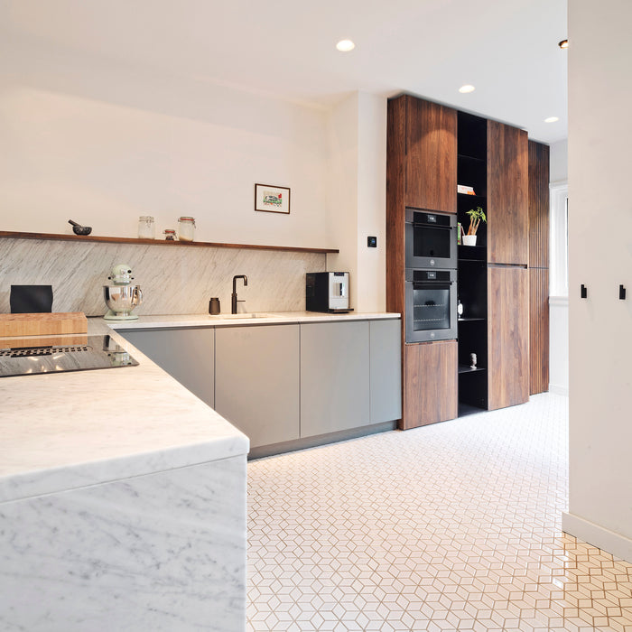 Een mysterieuze zwarte kastenwand, in supermat Arpa Fenix, vormt een sterk contrast met de mozaiekvloer en het marmeren blad. Extra professionele keukenapparatuur, zoals de Bora met frontbediening maken deze parallelopstelling een heerlijke plek om te koken.