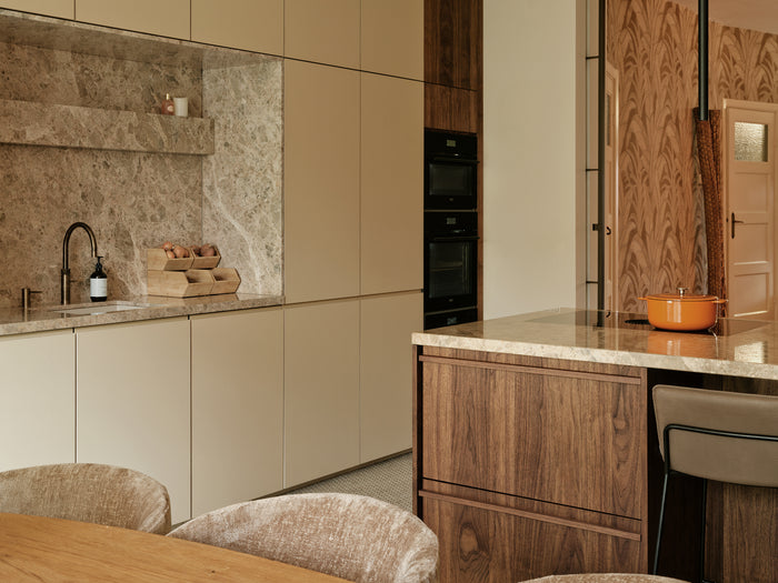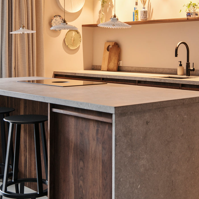 Dubbele hoekkeuken met Retrostone en warme accenten