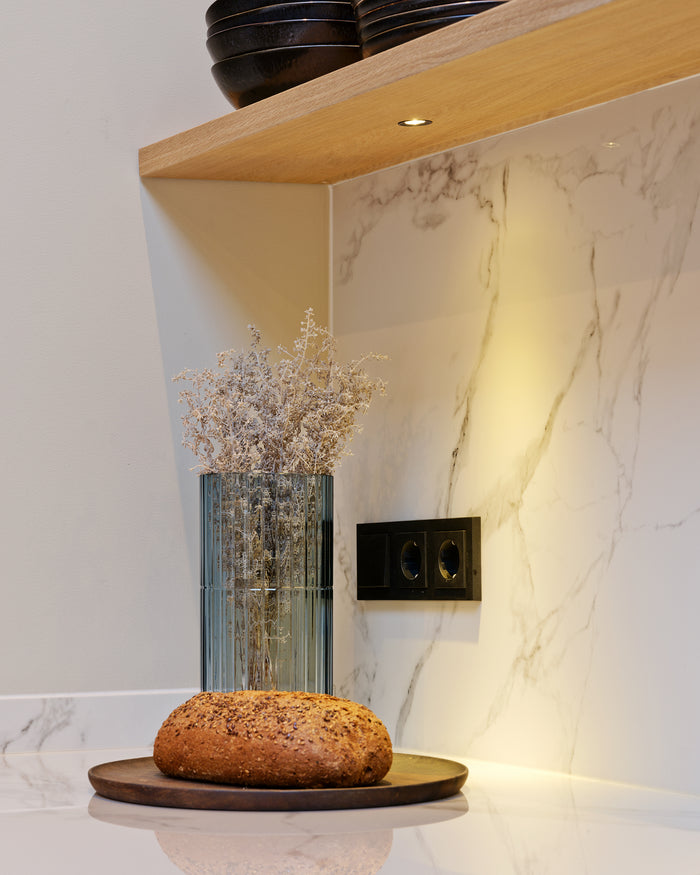Veel ruimte voor handige accessoires of persoonlijke verzamelingen. Een rustig palet van eiken, afgewisseld met mat witte vlakken en mysterieuze zwarte vakkenkasten uit onze Plato collectie.