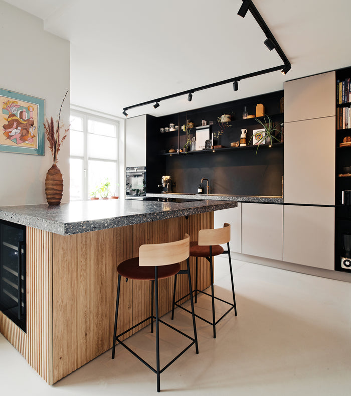 Lichte houtaccenten met zwarte keukenfronten combineren
