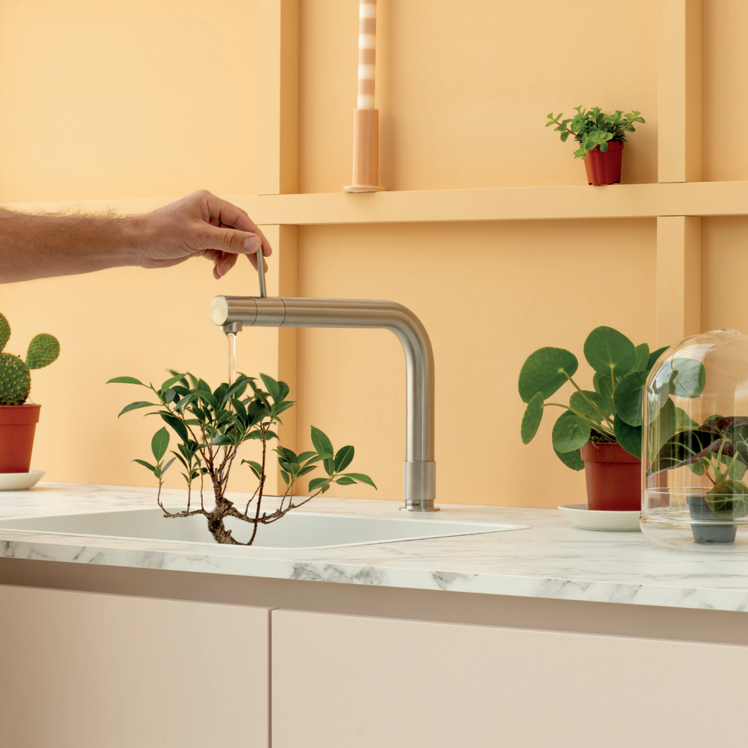 In steen of keramiek kunnen bijpassende spoelbakken van bladmateriaal worden vervaardigd. Zo ziet u geen verschil tussen aanrecht en wasbak. Voor een gemakkelijk te reinigen oplossing zijn RVS spoelbakken een vertrouwde oplossing. De voorgestanste afwatering in de bak garandeert een hygiënische en praktische bodem. Een Quooker Flex kraan komt zelfs in de hoeken, waarmee u nog beter uw spoelbak kunt schoonspoelen.