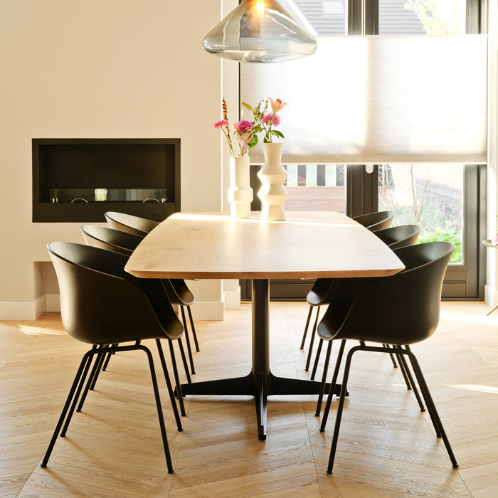 Onze collectie maatwerk design tafels is gevuld met eigen ontwerpen en designmerken. De vormentaal is verfijnd, met veel aandacht voor massief hout. De houten tafels op maat zijn gemakkelijk te combineren met onze eetkamerstoelen en verlichting.